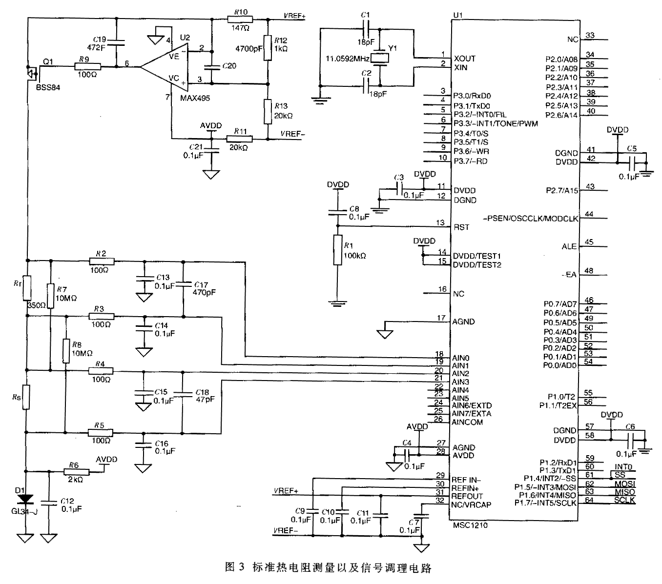 在圖3中,分壓電阻R12與R13為運(yùn)算放大器U2提供一個(gè)參考電壓,在R10上產(chǎn)生一個(gè)恒定的電流,經(jīng)Q1輸出。為了減少高精度低溫漂電阻的使用數(shù)量,R10、R12、R13均采用普通電阻。使用高精度低溫漂電阻Rr作為電流檢測(cè)電阻,將輸出電壓信號(hào)經(jīng)R2、R3送往MSC1210的一組差分輸入端,恒定電流通過(guò)四線標(biāo)準(zhǔn)鉑電阻Rs,將產(chǎn)生電壓經(jīng)R4、R5送入MSC1210的另一組差分輸入端,經(jīng)MSC1210進(jìn)行四線法測(cè)量電阻的計(jì)算,以消除鉑電阻溫度計(jì)引線的影響。R2、R3、R4、R5是限流電阻,防止輸入電壓過(guò)高損壞MSC1210;D1、R6、C12提供一個(gè)參考電壓,使MSC1210有合適的差分電壓輸入。由于使用MSC1210的內(nèi)置電壓標(biāo)準(zhǔn)輸出,電容C9、C10、C11是不可缺少的。MSC1210具有內(nèi)置PGA(1~128),因此無(wú)需放大電路即可直接測(cè)量微弱信號(hào)。